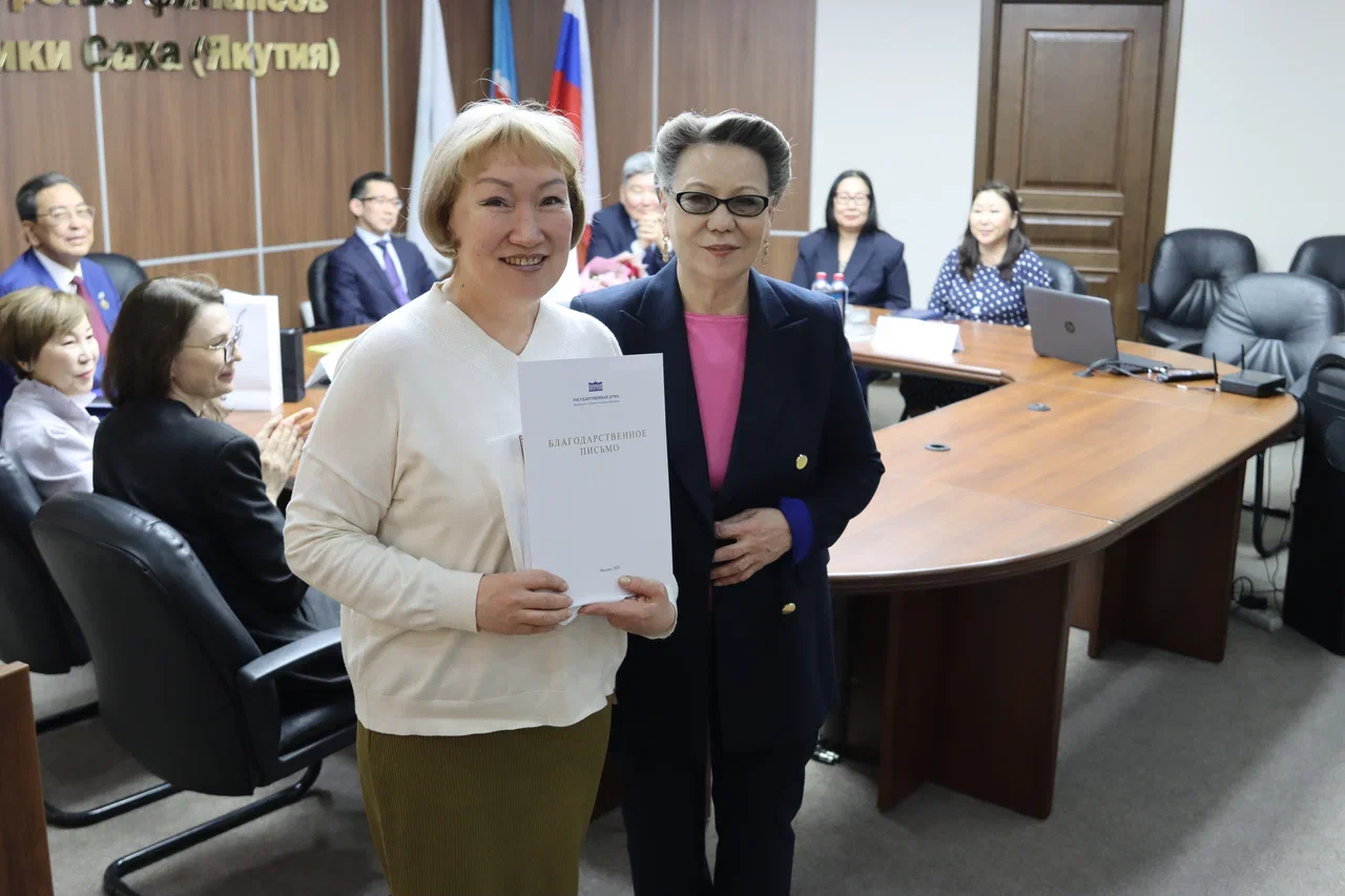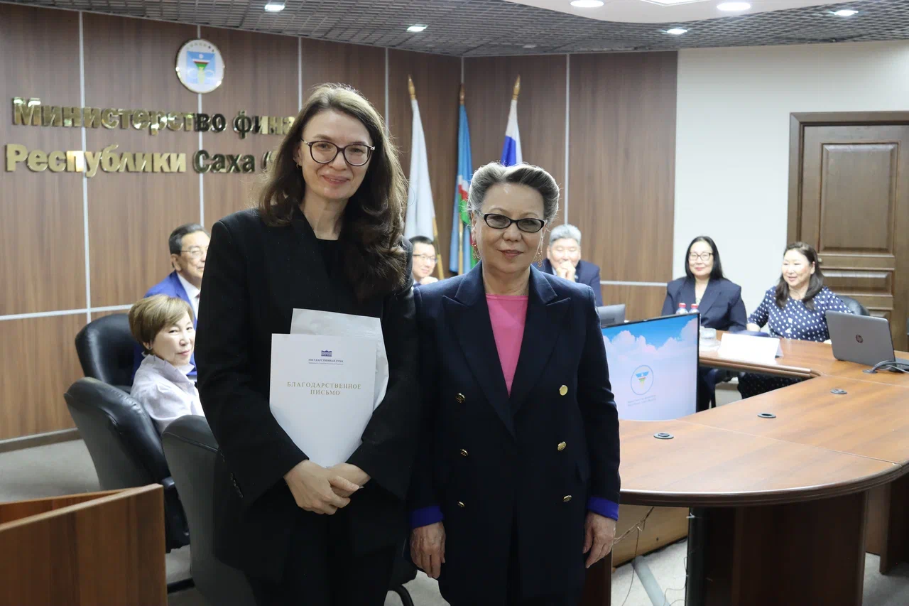 На встрече в Минфине депутат Госдумы РФ Галина Данчикова вручила Благодарственные письма и памятные сувениры за компетентность и личный вклад в обеспечение надежности и стабильности финансовой системы Якутии 11 ответственным сотрудникам министерства.